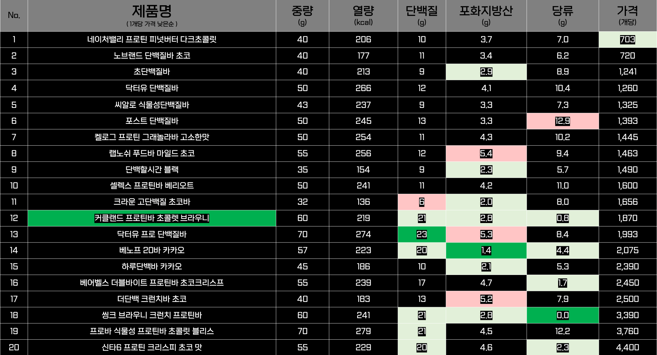 그리고 중량의 차이는 있지만 1개당 가격이 가장 낮은 제품은 네이처밸리 프로틴 피넛버터 다크초콜릿 제품이었고 가장 비싼 제품은 신타6 프로틴 크리스피 초코맛 제품이었습니다.