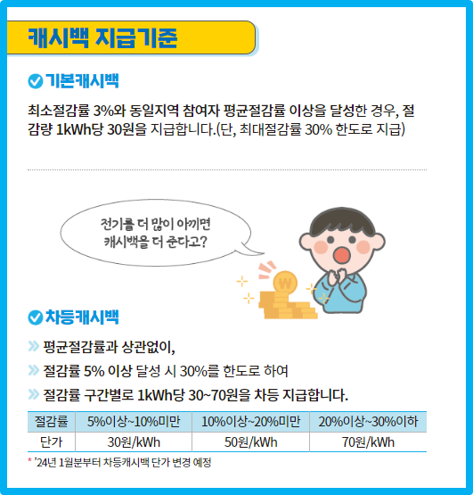 기본캐시백은 최소절감률 3%에 동일 지역 참여자 평균절감률 이상을 달성한 경우 절감량 1kWh 당 30원을 지급하며,