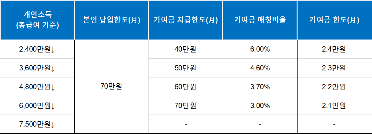 3. 연소득 4,800만원 초과 6,000만원 이하 / 70만원 납입 : (납입금 70만원 x 기여금 매칭비율 3%) + 70만원 = 72.1만원