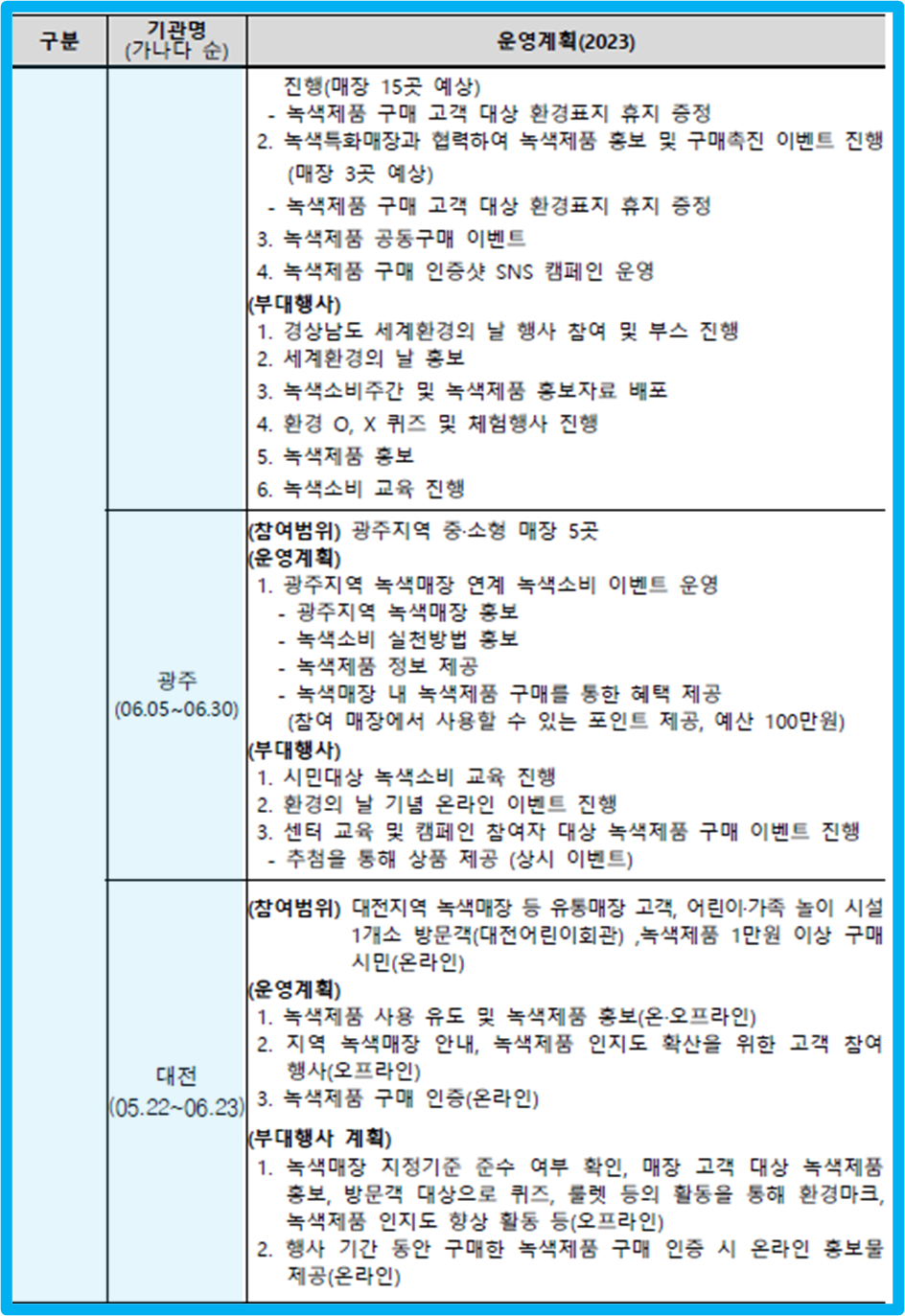 2023 녹색소비주간은 환경을 생각하는 소비를 장려하기 위해 환경부가 주관하고 한국환경산업기술원, 유통사, 금융사, 시민단체 등이 참여하는 행사입니다. 6월 한 달간(06.01~06.30) 진행되며, 녹색제품 할인 판매, 그린카드 혜택, 캠페인·이벤트 등 다양한 행사가 마련되어 있습니다.