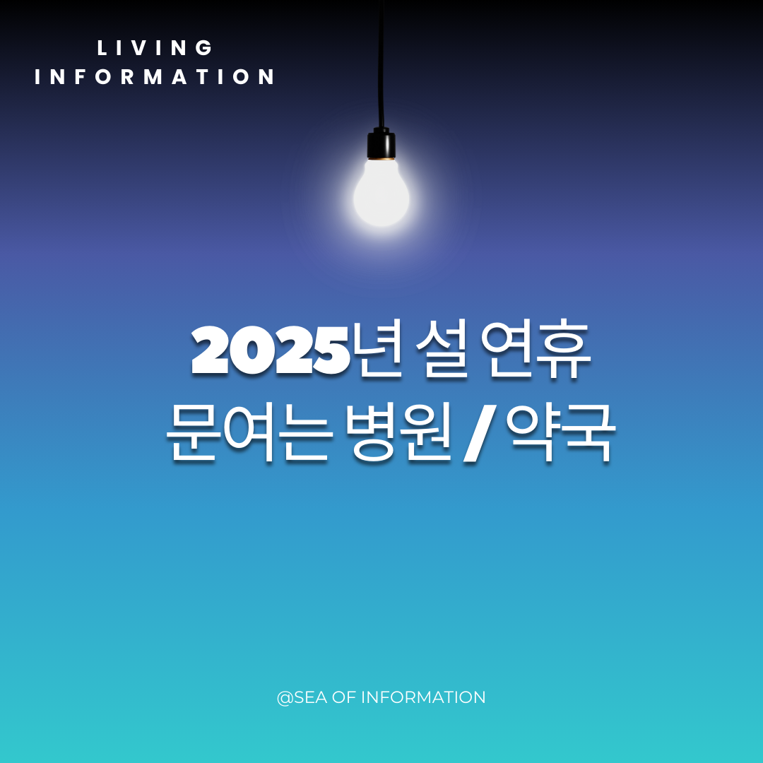 연휴 기간 ‘문 여는 병의원, 약국’에 대한 정보는 서울시 ‘2025 설 연휴 종합정보’ 누리집, 25개 자치구 누리집, 응급의료포털, 네이버 지도, 카카오맵에서 확인할 수 있답니다.